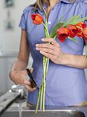 If you have a garden that you would like to use for arranging flowers, find a vase you would like to use and support it with a base to stick flowers into. Cut flowers from your garden early in the morning, as the stems contain more water in them than later in the day and wont wilt as quickly, then synchronize the color of your flowers with your environment. Of course, with practice, you can do much more inventing as you go along.